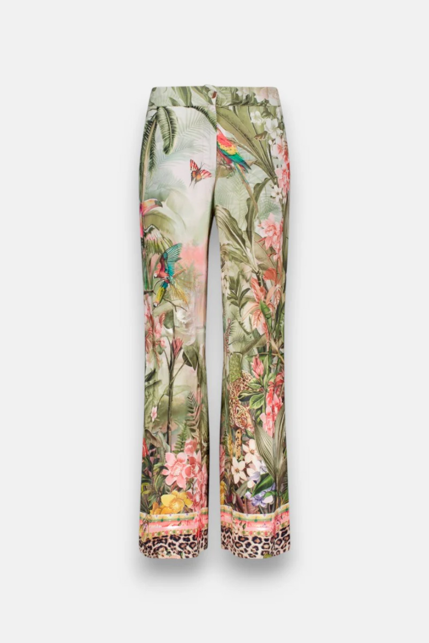 Fliessende weite Hose mit Knopf- und Reissverschluss. Hinten elastischer Bund. Zwei seitliche Taschen. Allover Jungle-Leo-Print.